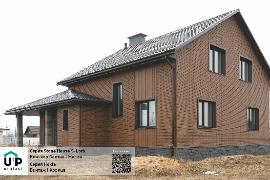 Сайдинг Ю-Пласт Стоун Хаус S-Lock Клинкер Балтик Цемент используется для отделки наружных стен зданий и декоративных конструкций, внешне имитирует клинкерный кирпич.