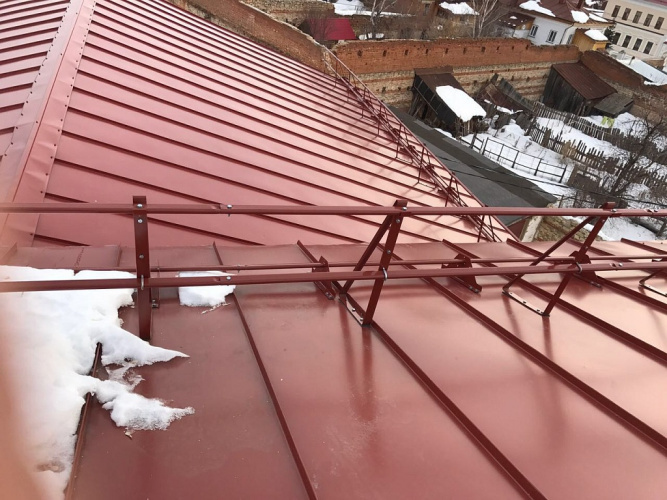 Кровельные ограждения предназначены для обеспечения безопасности людей при передвижении по кровле и предотвращения падения при эксплуатации, ремонте и обслуживании кровли.Состоят из металлических труб на кронштейнах, устанавливаются вдоль карниза и на переходных мостиках.