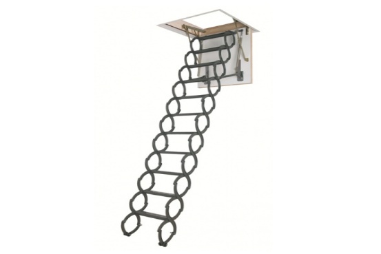 Модели ножничных лестниц выполнены из металла, защищенного от коррозии. Поставляются совместно с потолочным коробом, позволяющим хранить сложенную чердачную лестницу «в потолке». Можно купить чердачные лестницы в обычном исполнении, поставляемые с термоизоляционной крышкой, либо огнестойкие. Они выполняются из огнеупорных материалов огнестойкостью до 15 минут, имеют сертификаты соответствия пожарным требованиям, принятым в России и Европе. Предельная нагрузка на всю лестницу ограничивается 200 кг. Высоту при необходимости можно увеличить за счет установки дополнительных ступеней LSS.