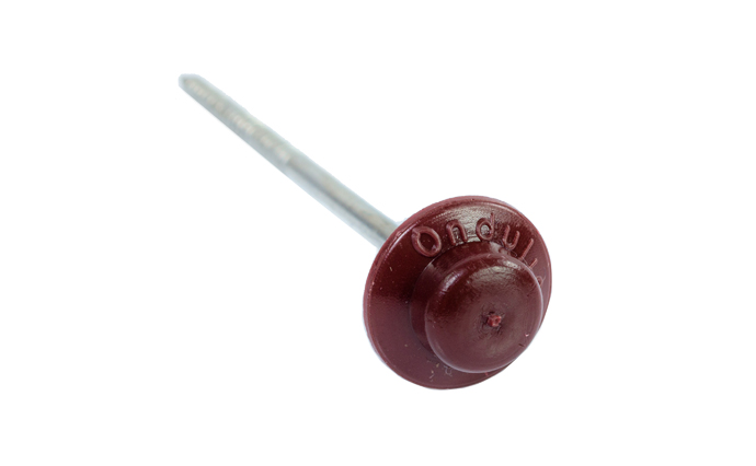 Кровельные гвозди для продукции Ондулин красного цвета, благодаря широким пластиковым шляпкам и кольцевому профилю стержня надежно фиксируют покрытие, защищают его от ветра и влаги.